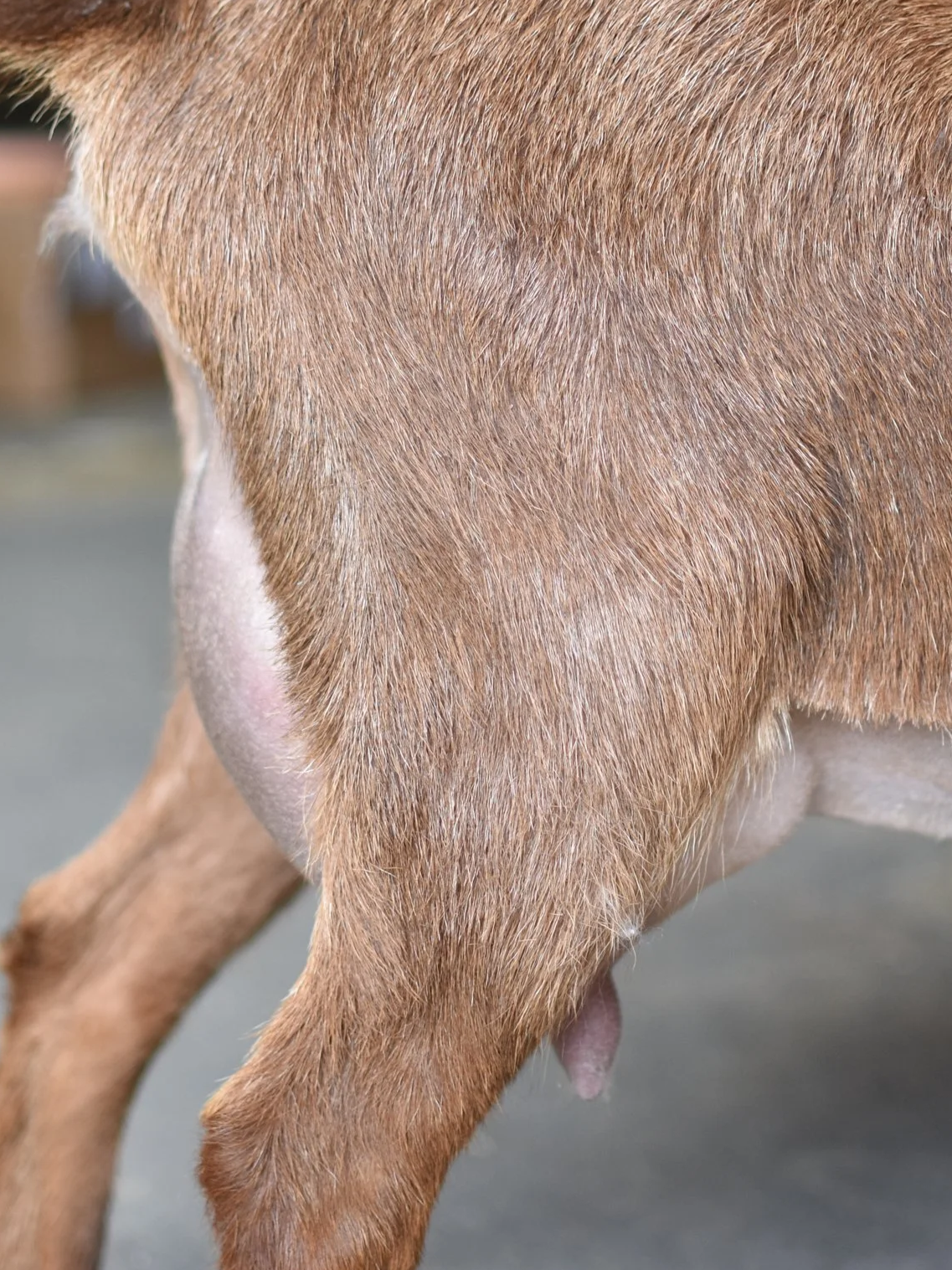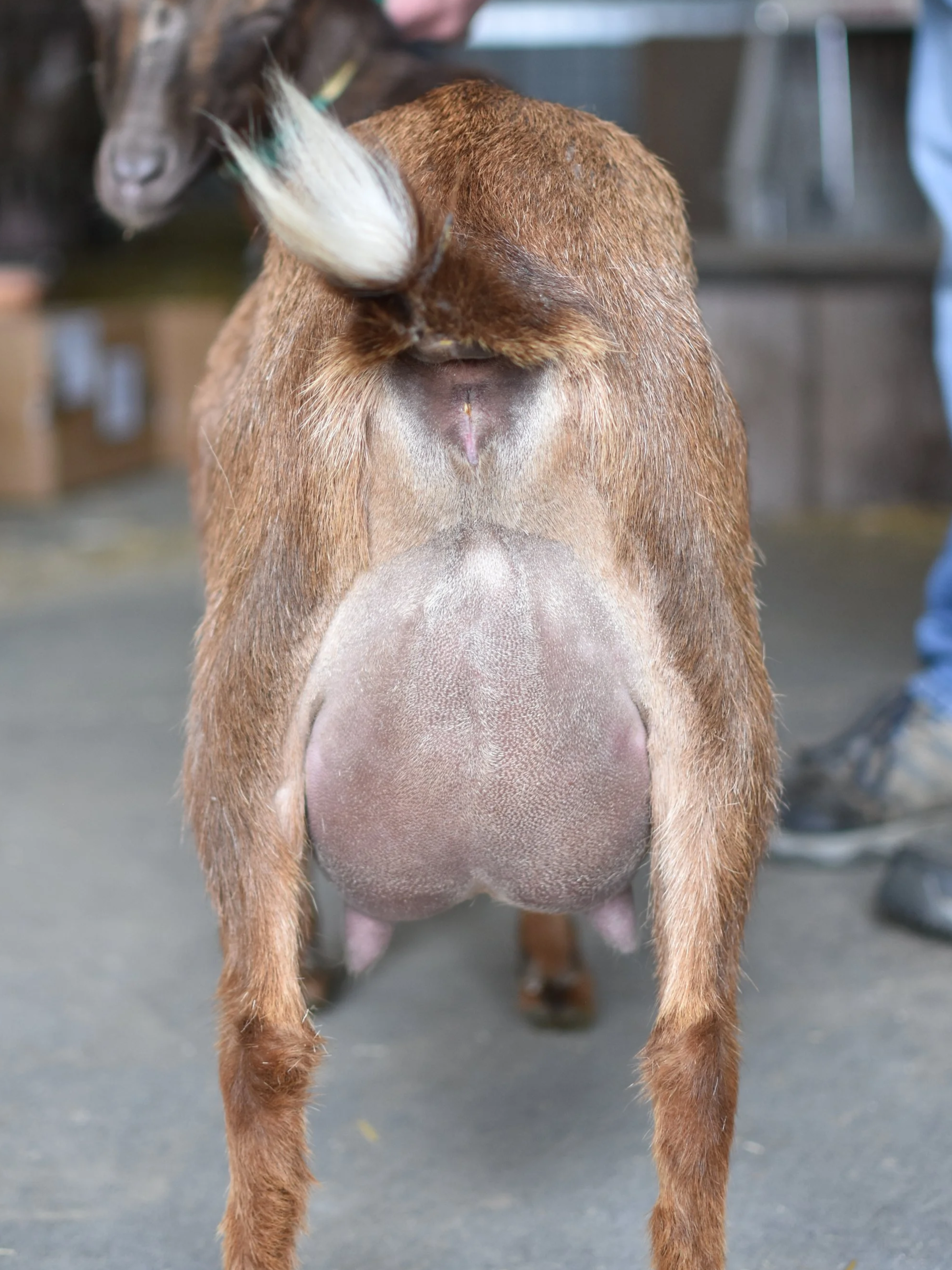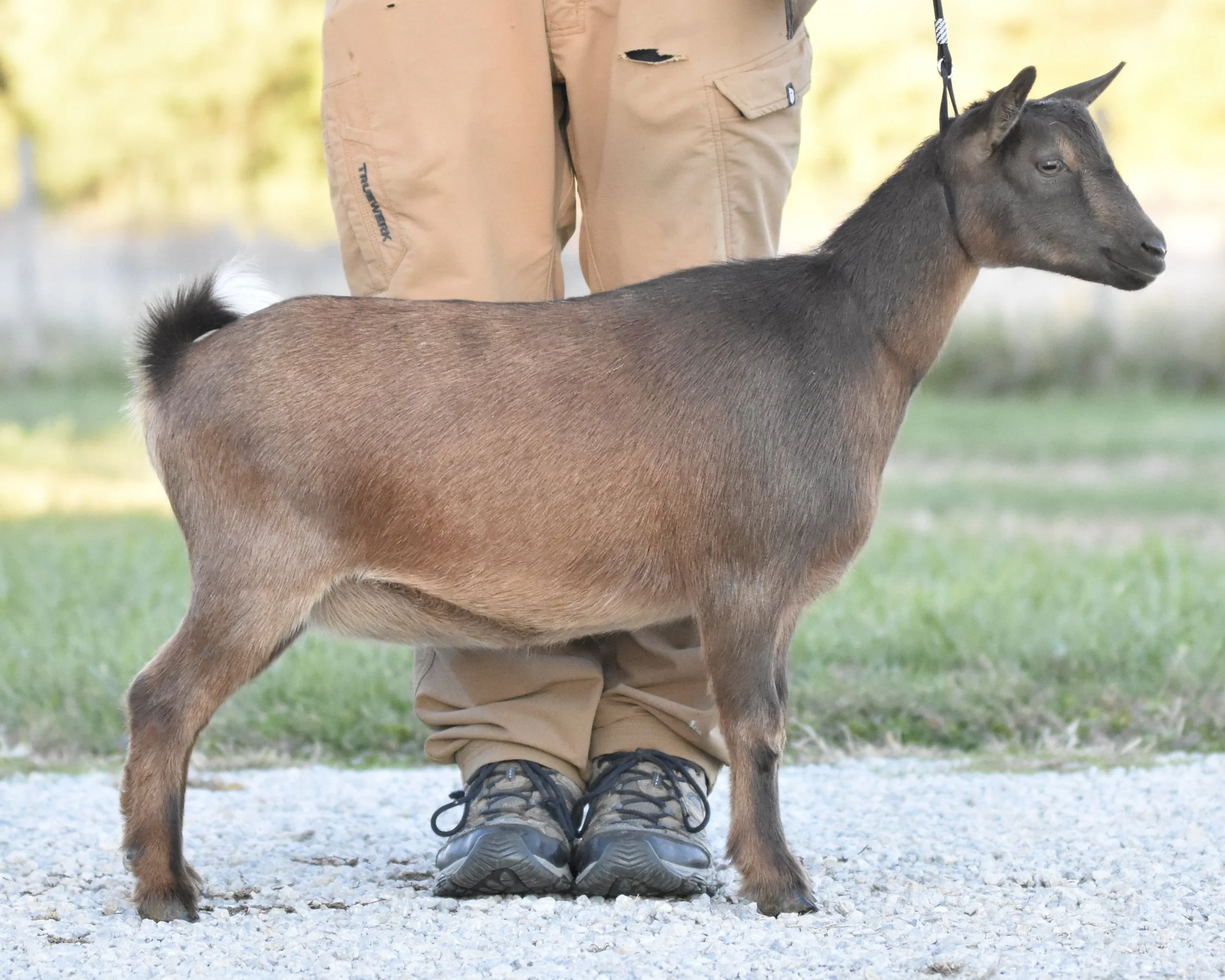Frannie is a doe from my favorite doe line that we were lucky enough to snatch up last fall! She is very dairy, straight legged, and freshened with a very correct, well attached udder! This line tends to be a little slower to mature, so I can’t wait to see her in the years to come!