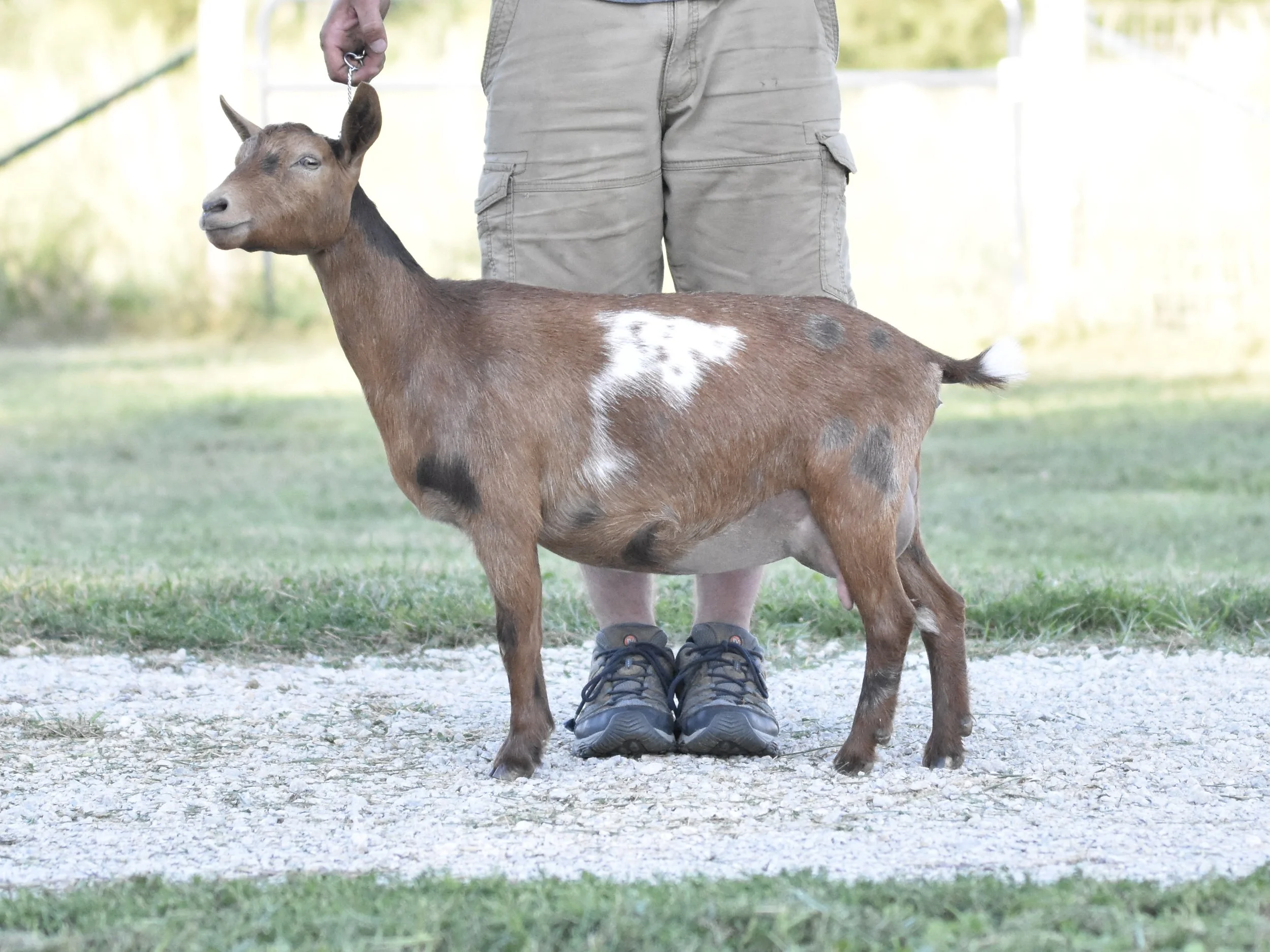 Miss T is one of triplet doelings that I hung on to all summer before deciding on my keeper. T showed consistently at the top of her class being complemented on her width and her escutcheon. T freshened as a yearling with a beautiful wide rear udder and smooth fore udder with a lot of extension. She continues to show a lot of width and depth. Her dam is my favorite doe in our herd and I can’t wait to see if T follows in her footsteps.